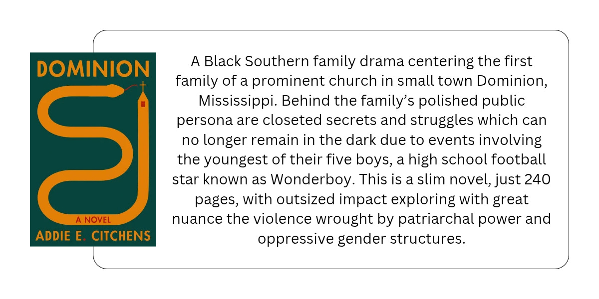 Dominion by Addie E. Citchens. A Black Southern family drama centering the first family of a prominent church in small town Dominion, Mississippi. Behind the family’s polished public persona are closeted secrets and struggles which can no longer remain in the dark due to events involving the youngest of their five boys, a high school football star known as Wonderboy. This is a slim novel, just 240 pages, with outsized impact exploring with great nuance the violence wrought by patriarchal power and oppressive gender structures. Longlisted for the Center for Fiction 2025 First Novel Prize.
